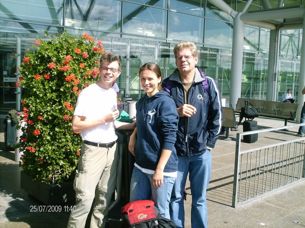 Am Samstag, den 25.7.2009 flogen wir morgens mit einem nicht genannten Billigflieger von Berlin nach London Stansted. Das Problem mit Billigfliegern ist, daß sie nur dann billig sind, wenn man nur mit einer Zahnbürste verreist. Wenn man ein Rad mitnimmt, wird das ganze deutlich teurer. Aber was solls, es war ein Direktflug zum verkehrstechnisch günstigsten Flughafen Stansted (41 km Anfahrt zum Startort) und insgesamt war der Preis ok, also Schluß mit Jammern! Den Anreise-Tag und die Nacht verbrachten wir im Airport-Hotel, welches freundlicherweise unsere Radkoffer einlagerte. Dort kann man zu Fuß vom Flughafen mit dem Radkoffer auf dem Gepäcktrolley hingehen und das Rad zusammensetzen - superpraktisch! Ist natürlich nicht ganz billig, aber man gönnt sich ja sonst nichts! Den Abend verbrachten wir im Hotel-Restaurant, wo Nicole und Klaus Kinderportion-Nudeln zu Erwachsenen-Preisen verzehrten und ich meine große Pizza vor hungrigen Blicken mit Messer und Gabel verteidigte!. Der abendliche Blick auf den Wetterbericht bei BBC im Fernsehen verhieß nichts Gutes für die kommende Woche, wir waren also gewarnt. Klaus und ich waren der Meinung, daß uns nach P-B-P 2007 sowieso nichts erschüttern können würde.