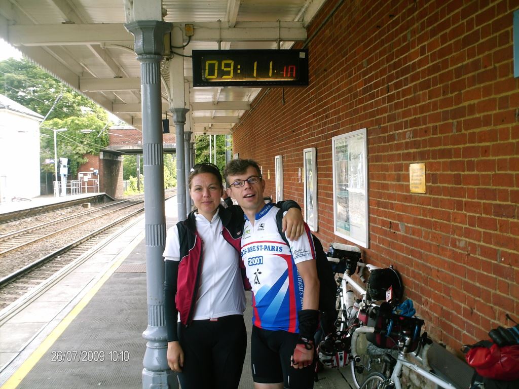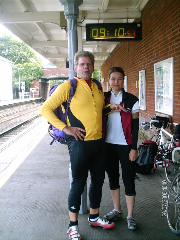 Am Sonntag, den 26.7.2009 fuhren wir mit dem Rad (ohne Frühstück, auch wenn es Klaus schwer fiel!) 10 km zum nächsten Ort zur Bahnstation, wo ein Cafe extra für uns 1/2 Stunde früher aufmachte und wir ein leckeres englisches Frühstück verzehrten: Tee, Baked Beans on Toast, gebratene Tomate, gebratene Pilze und gebratender Schinken sowie ein Spiegelei ließen unseren Cholesterinspiegel in ungeahnte Höhen schnellen, machten jedoch angenehm satt und bereiteten uns auf die Strapazen der kommenden Tage vor. Thanks for the Breakfast, I know where you are, but I forgot your name!