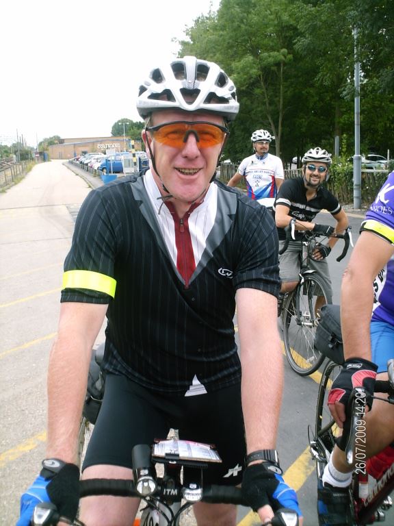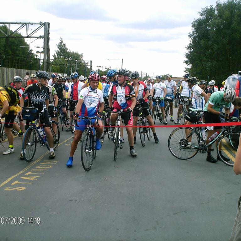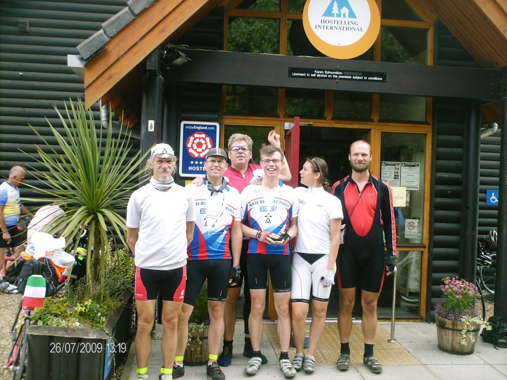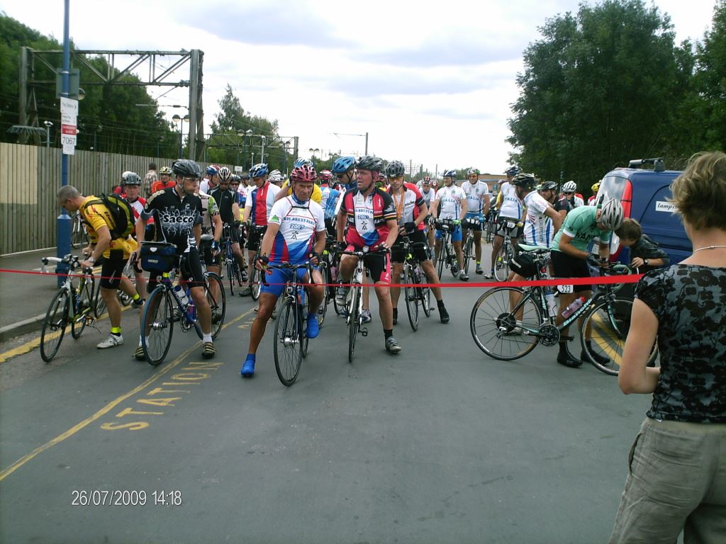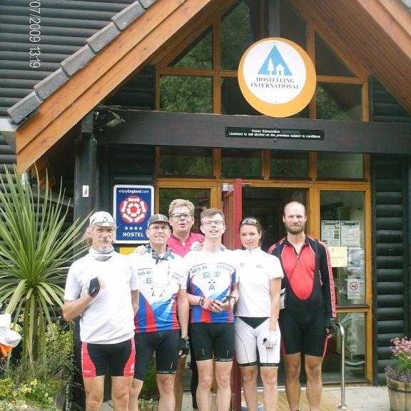 Der Start erfolgte 13:45 Uhr vom Bahnhofsvorplatz, und eine Meute von ca 50 Radfahrern machte sich auf den Weg gen Norden. An der ersten nennenswerten Steigung löste sich gleich Joachims Kette auf- ein Start nach Maß!! Es wurde wegen des Rückenwindes schnell gefahren (über 30 km/h Schnitt!) und jung und unerfahren wie wir waren fuhren wir die ganze Zeit mit! Nicole, Klaus, Ingo, Ulf und ich fuhren zusammen. Die Strecke war wunderschön, schmale englische country lanes mit Hecken rechts und links, die ganze Zeit auf und ab, schnuckelige kleine Dörfer, schmale hohe Brücken über kleine Flüsschen- Wunderschön! Das Wetter spielte noch mit, ab km 100 fing es aber an zu nieseln, und der Niesel wurde bald zu richtigem Regen. Scheiße! Als wir uns gegen 3 Uhr morgens in Thorne zum Schlafen hinlegten, hatten wir 321 km auf der Uhr und Wasser in den Schuhen.