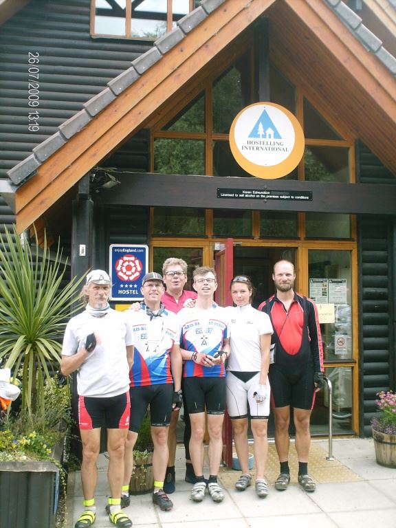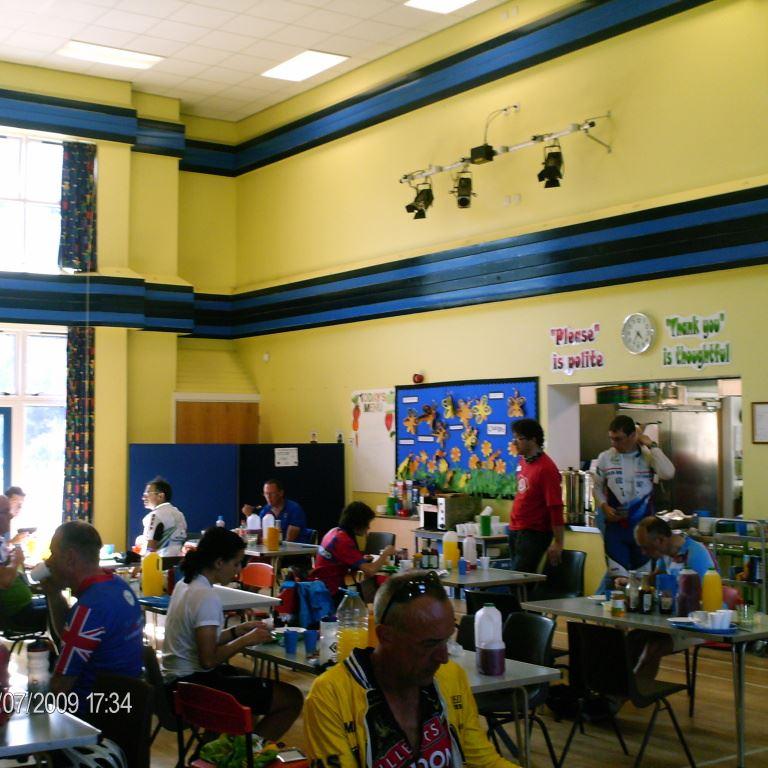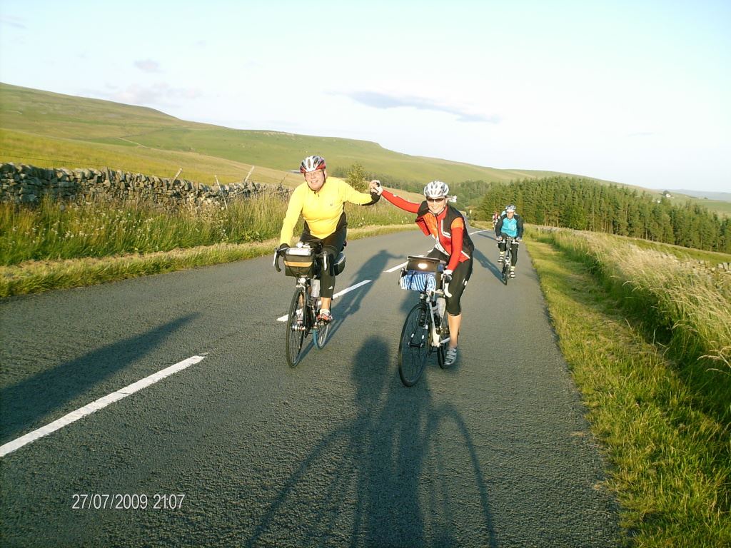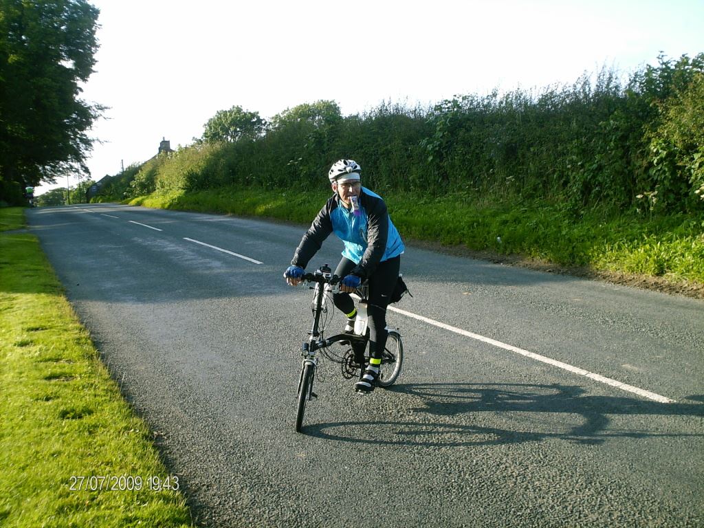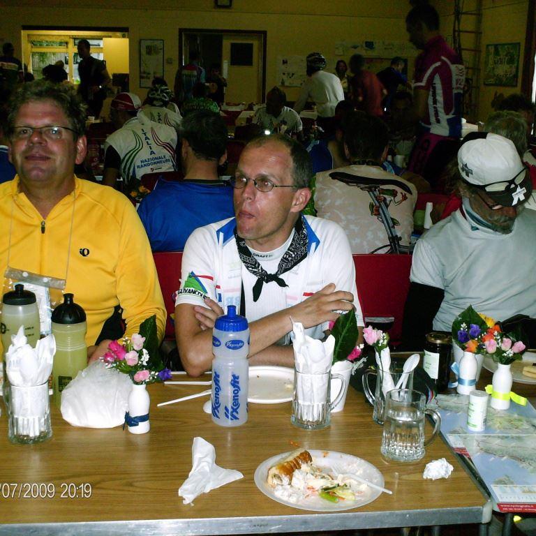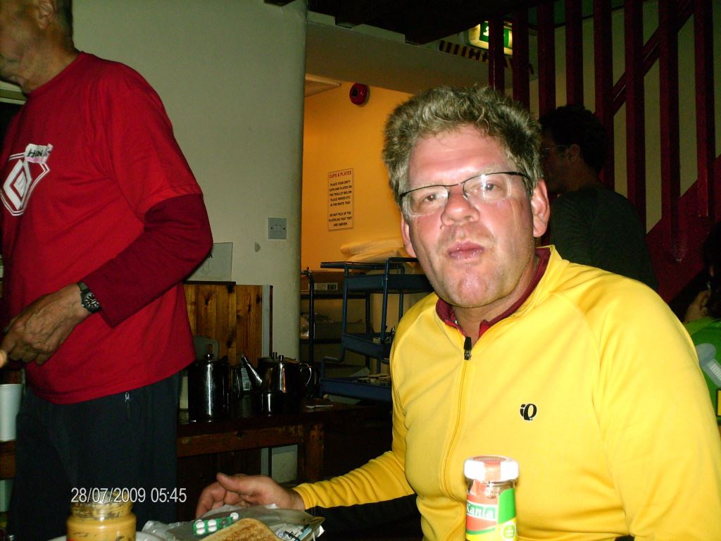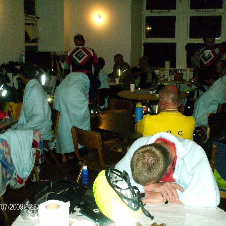 Für diesen Husarenritt bekamen wir am Montag, den 27.7.2009 auch die Quittung: wir fuhren wie alte Männer (bis auf Ingo und Ulf, die hatten noch gute Beine und fuhren dann bald ohne uns weiter). Auch eine Gruppe Italiener , die sich von gestern erholte, schlich in unserem Tempo mit wie Danilo De Luca ohne Doping. Die Strecke wurde etwas ebener, bis kurz vor Coxwood nach 80 Tages-Km einige fiese Rampen auf uns warteten. Coxwood ist ein sehr schöner, malerisch gelegener Ort, und auch die Kontrolle ist sehr gemütlich und es gab wie überall leckeres Essen in ausreichenden Mengen. Bei jeder Kontrolle aß ich 2 Teller warmes Essen, obendrauf gab es noch lecker Nachtisch, Kuchen oder Flapjacks. Richtung Middleton Tyas (50km weiter) wurde es jetzt wieder etwas hügeliger, und meine Lebensgeister kehrten langsam aus dem Magen in die Beine zrurück. Unterwegs lernten wir noch den israelischen Brevet-Organisator Thal kennen, der alle Brevets und LEL auf einem Brompton-Faltrad fährt: Chapeux! Nach Middleton Tyas erklommen wir den höchsten Punkt der Strecke (Yad Moss 598m), bevor wir eine schöne Abfahrt nach Alsten hatten, wo wir mit Einbruch der Dunkelheit eintrafen. Wir waren an diesem Tag nur knapp 220 km gefahren, und die richtigen Berge würden erst noch kommen!