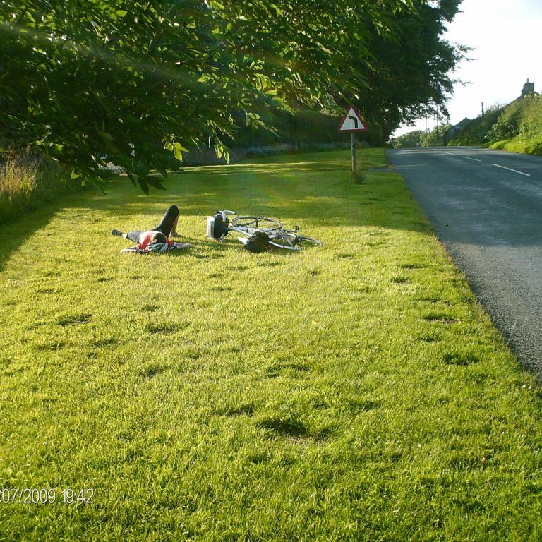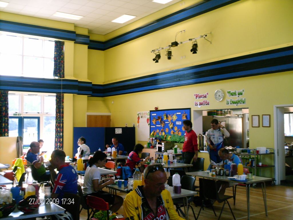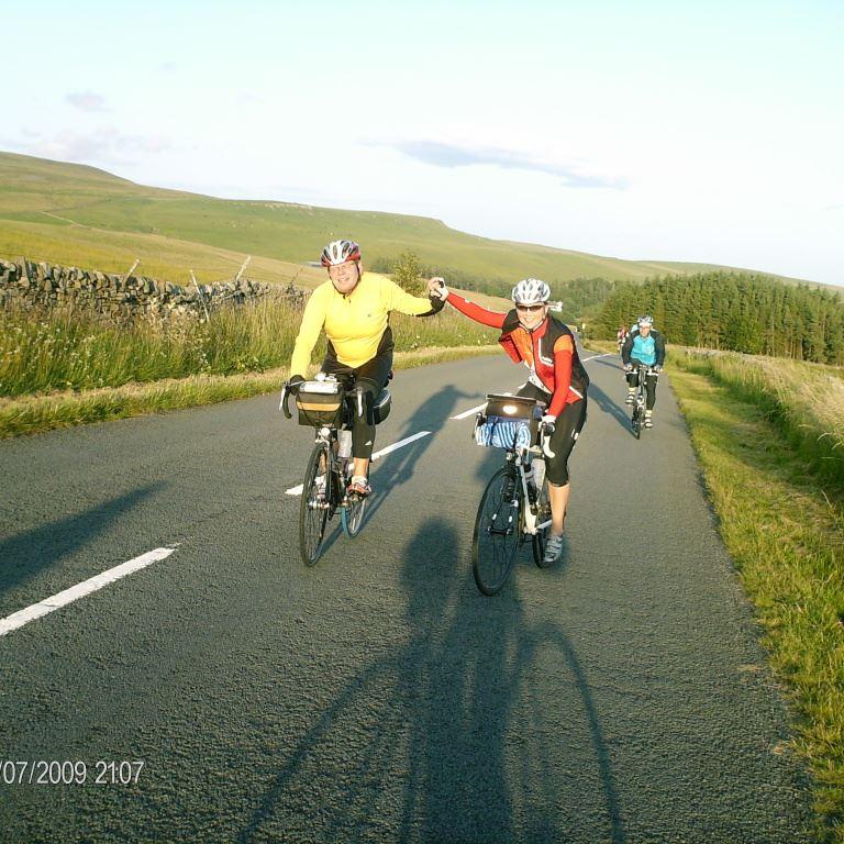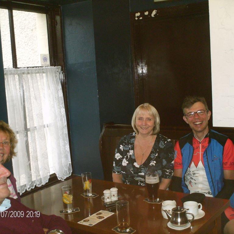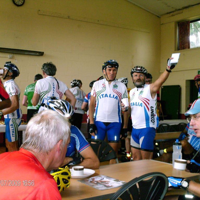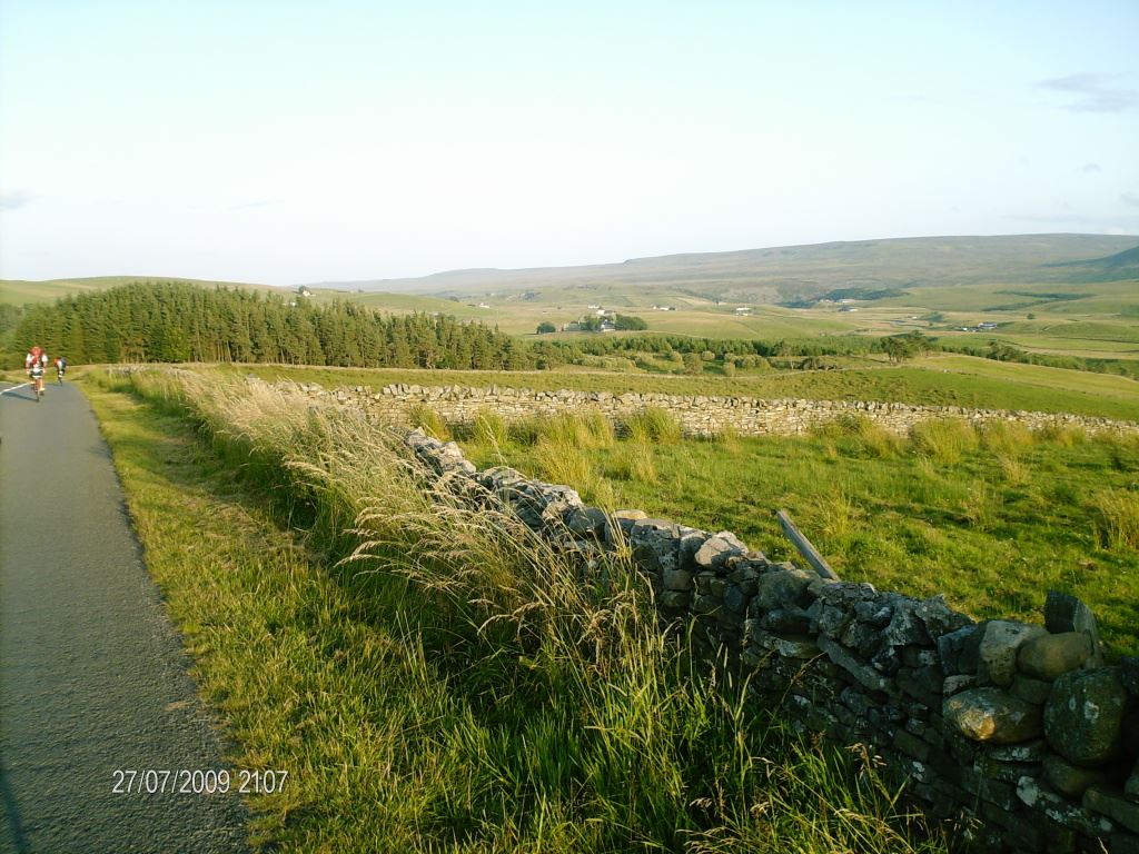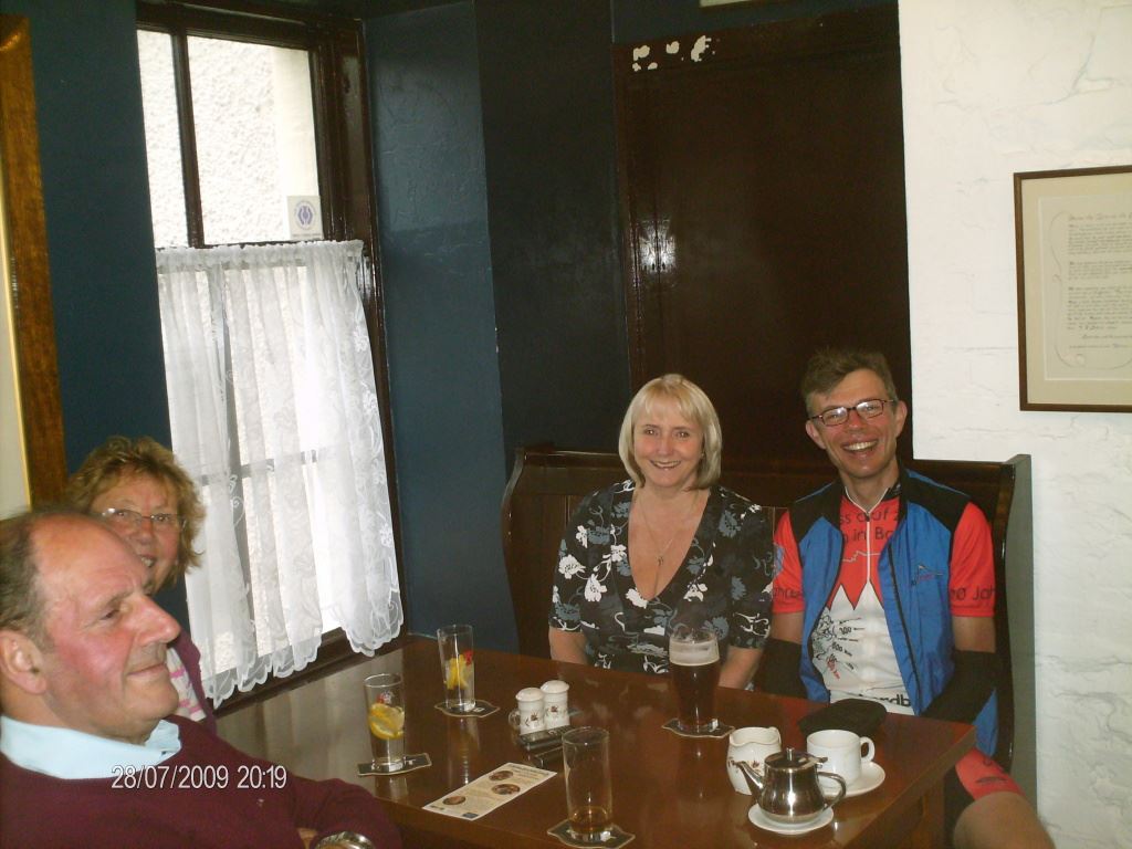 Für diesen Husarenritt bekamen wir am Montag, den 27.7.2009 auch die Quittung: wir fuhren wie alte Männer (bis auf Ingo und Ulf, die hatten noch gute Beine und fuhren dann bald ohne uns weiter). Auch eine Gruppe Italiener , die sich von gestern erholte, schlich in unserem Tempo mit wie Danilo De Luca ohne Doping. Die Strecke wurde etwas ebener, bis kurz vor Coxwood nach 80 Tages-Km einige fiese Rampen auf uns warteten. Coxwood ist ein sehr schöner, malerisch gelegener Ort, und auch die Kontrolle ist sehr gemütlich und es gab wie überall leckeres Essen in ausreichenden Mengen. Bei jeder Kontrolle aß ich 2 Teller warmes Essen, obendrauf gab es noch lecker Nachtisch, Kuchen oder Flapjacks. Richtung Middleton Tyas (50km weiter) wurde es jetzt wieder etwas hügeliger, und meine Lebensgeister kehrten langsam aus dem Magen in die Beine zrurück. Unterwegs lernten wir noch den israelischen Brevet-Organisator Thal kennen, der alle Brevets und LEL auf einem Brompton-Faltrad fährt: Chapeux! Nach Middleton Tyas erklommen wir den höchsten Punkt der Strecke (Yad Moss 598m), bevor wir eine schöne Abfahrt nach Alsten hatten, wo wir mit Einbruch der Dunkelheit eintrafen. Wir waren an diesem Tag nur knapp 220 km gefahren, und die richtigen Berge würden erst noch kommen!