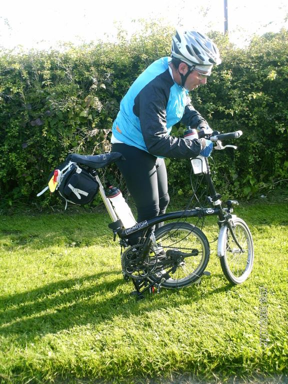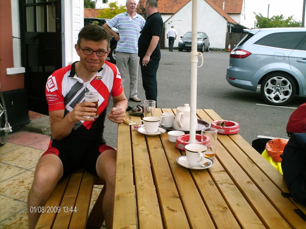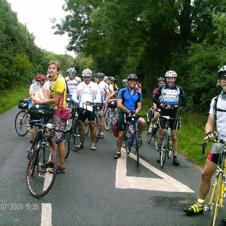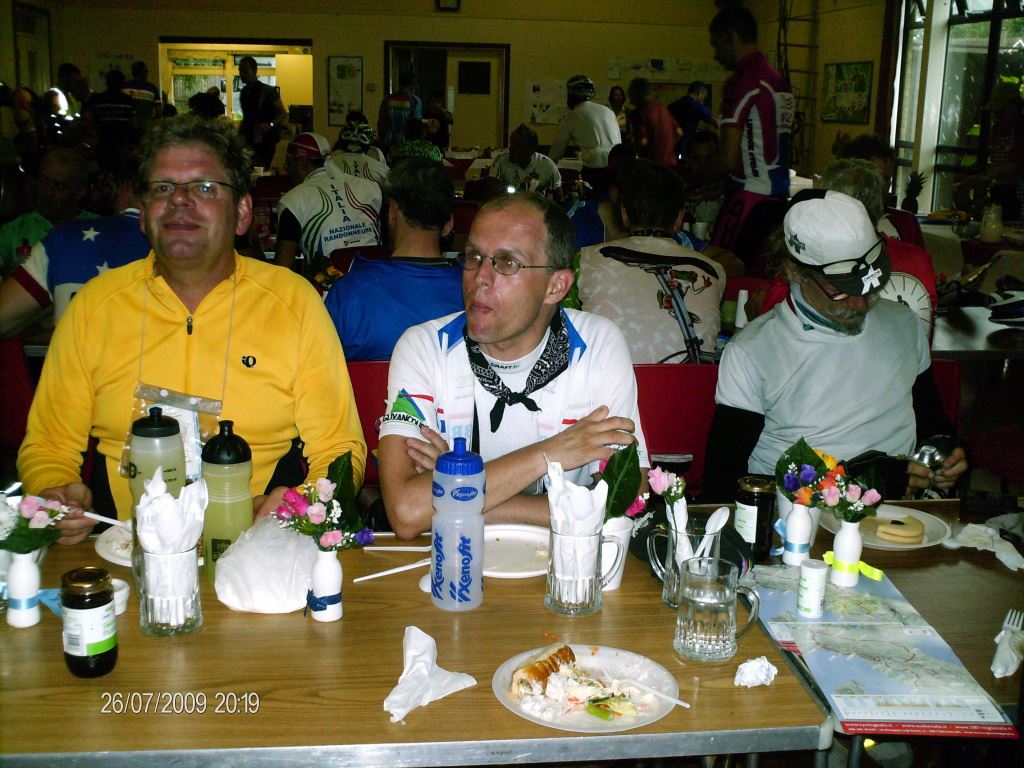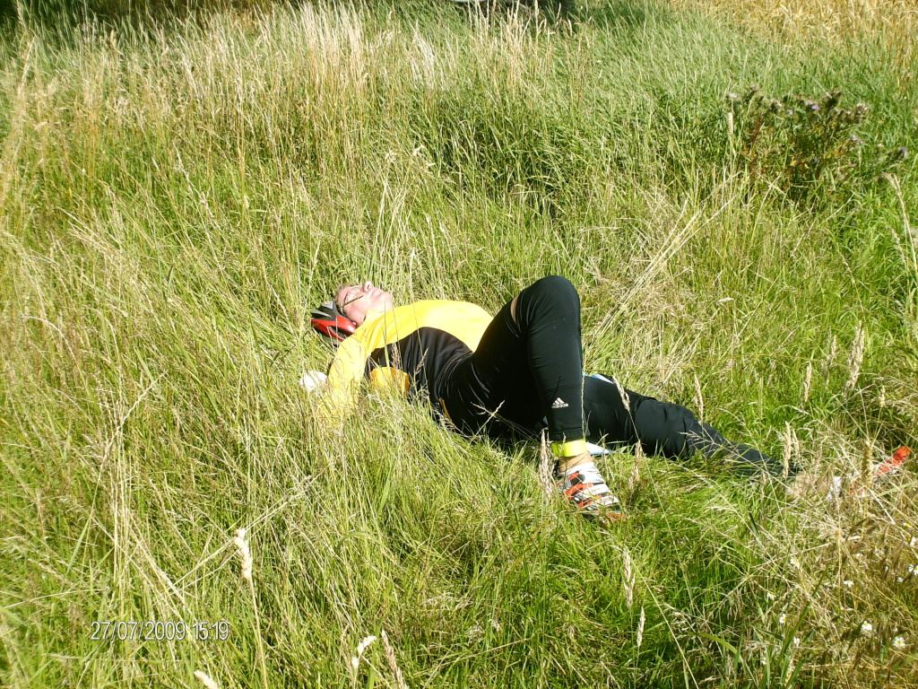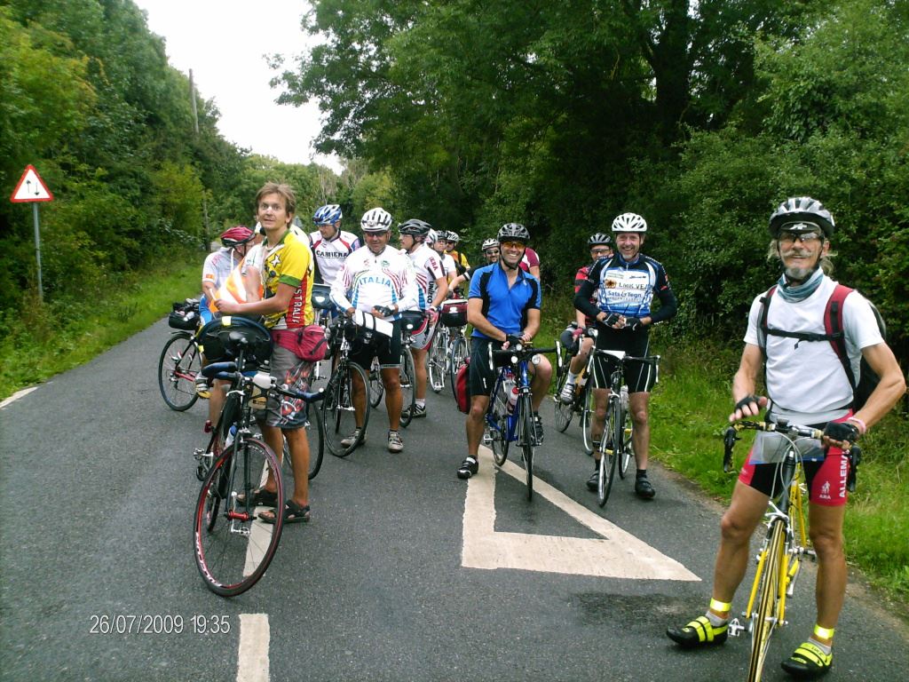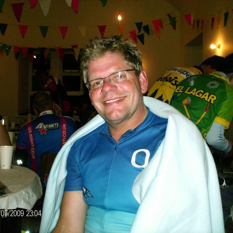 Für diesen Husarenritt bekamen wir am Montag, den 27.7.2009 auch die Quittung: wir fuhren wie alte Männer (bis auf Ingo und Ulf, die hatten noch gute Beine und fuhren dann bald ohne uns weiter). Auch eine Gruppe Italiener , die sich von gestern erholte, schlich in unserem Tempo mit wie Danilo De Luca ohne Doping. Die Strecke wurde etwas ebener, bis kurz vor Coxwood nach 80 Tages-Km einige fiese Rampen auf uns warteten. Coxwood ist ein sehr schöner, malerisch gelegener Ort, und auch die Kontrolle ist sehr gemütlich und es gab wie überall leckeres Essen in ausreichenden Mengen. Bei jeder Kontrolle aß ich 2 Teller warmes Essen, obendrauf gab es noch lecker Nachtisch, Kuchen oder Flapjacks. Richtung Middleton Tyas (50km weiter) wurde es jetzt wieder etwas hügeliger, und meine Lebensgeister kehrten langsam aus dem Magen in die Beine zrurück. Unterwegs lernten wir noch den israelischen Brevet-Organisator Thal kennen, der alle Brevets und LEL auf einem Brompton-Faltrad fährt: Chapeux! Nach Middleton Tyas erklommen wir den höchsten Punkt der Strecke (Yad Moss 598m), bevor wir eine schöne Abfahrt nach Alsten hatten, wo wir mit Einbruch der Dunkelheit eintrafen. Wir waren an diesem Tag nur knapp 220 km gefahren, und die richtigen Berge würden erst noch kommen!