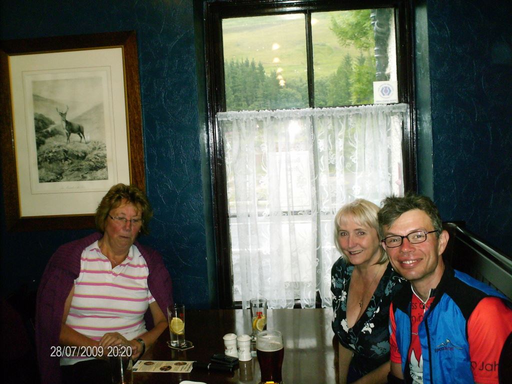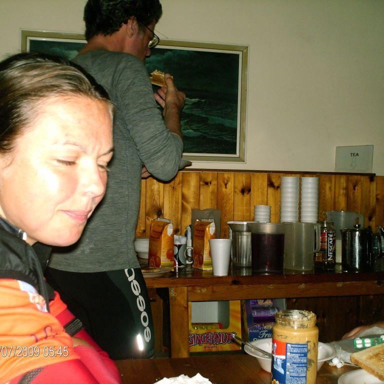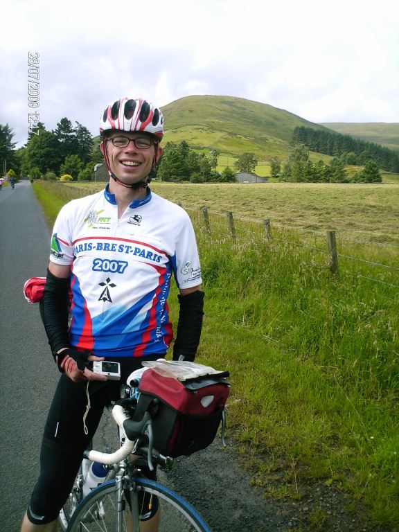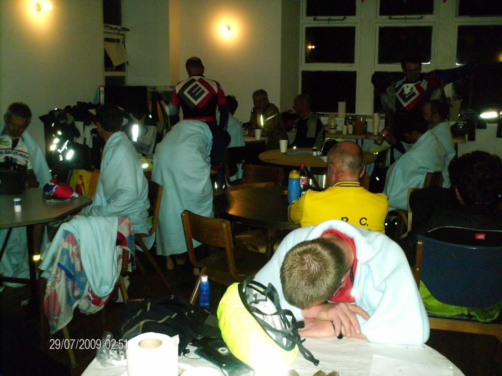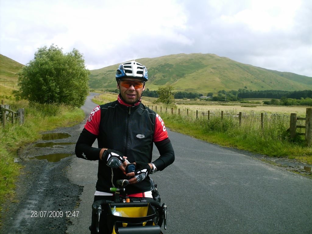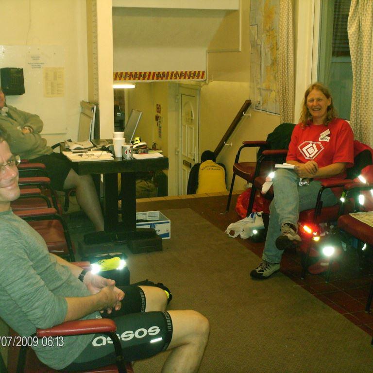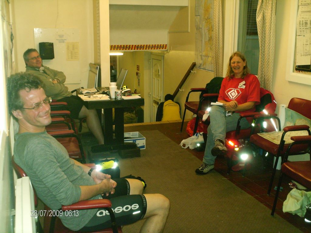 Am Dienstag, den 28.7.2009 standen wir gegen 5 Uhr auf und machten uns gut ausgeschlafen (6 Stunden Schlaf) auf die nächste Etappe. Nicole und KLaus fuhren ohne mich weiter, als ich meine eine Schuhplatte richten mußte, da sie sich verschoben hatte und ich Knöchelschmerzen bekam. Da Nicole und KLaus in der Ebene stärker sind als ich, ich dafür besser die Berge hochkomme, war das in Ordnung so, wir hätten uns sonst gegenseitig gebremst. Wir trafen uns in der nächsten Kontrolle in Eskdalemuir wieder, ich hatte die beiden fast eingeholt. Auf dem Weg nach Eskdalemuir hatte der Wind merklich aufgefrischt, ab Eskdalemuir schob er uns mit Nachdruck die Berge hoch, und ich dachte mit Schaudern an die Rückfahrt, wo wir uns gegen den Wind vorankämpfen mußten. Ich entwickelte mich zum Pannenkönig (insgesamt 6 Platte bei LEL) und Nicole und Klaus zogen an mir vorbei. Kurz vor Edinburgh hatte ich sie aber wieder. Joachim, der Rusty Racer kam mir entgegen, schon auf dem Rückweg von Edinburgh. In Edinburgh war mein Bagdrop, ich duschte und zog frische Radkleidung an. Die alte Kleidung stellte ich in die Ecke und faltete sie mit ein paar Handkantenschlägen zusammen. Nicole hatte mittlerweile ziehmlich starke Knieschmerzen, wollte aber unbedingt weiterfahren so lange es geht. Gegen 16 Uhr ging es aus Edinburgh zurück, und wir kämpften uns die ganzen Berge bei Gegenwind hoch und runter (Maximalgeschwindigkeit bergab 25 km/h!) Am Grdon Arms Hotel, einem Pub an einer Straßenkreuzung, sah ich gerade eine Regenfront über die Bergeauf mich zurollen, da konnte ich nicht wiederstehen (ich war gerade trocken!) und setzte mich in den Pub auf eine Kanne Tee, wo ich gleich mit den Gästen ins Gespräch kam. Nützte aber nichts, es ging raus in den Dauerregen und den Gegenwind (schon fast Sturm) und noch 40 km bis Eskdalemuir. 500 m vor dem Kontrollpunkt hatte ich noch einen Platten! Meine erste Überlegung war, nur kurz in Eskdalemuir zu bleiben, aber der Platte und der Dauerregeln belehrten mich eines besseren, außerdem wäre ich gegen die Strömung nicht die Berge hochgekommen. Die Kontrollstelle war überfüllt, die Feuchtigkeit tropfte von den Wänden (Kondenswasser!) die Betten waren ausgebucht, zum Glück hatte ich meinen Schlafsack dabei, mit dem ich mich in eine Ecke gelegt habe und eine Stunde schlief. Nicole und Klaus waren auch da, hatten aber noch ein Bett abbekommen. Tagesleistung: knapp 265 km, schon etwas besser als gestern!