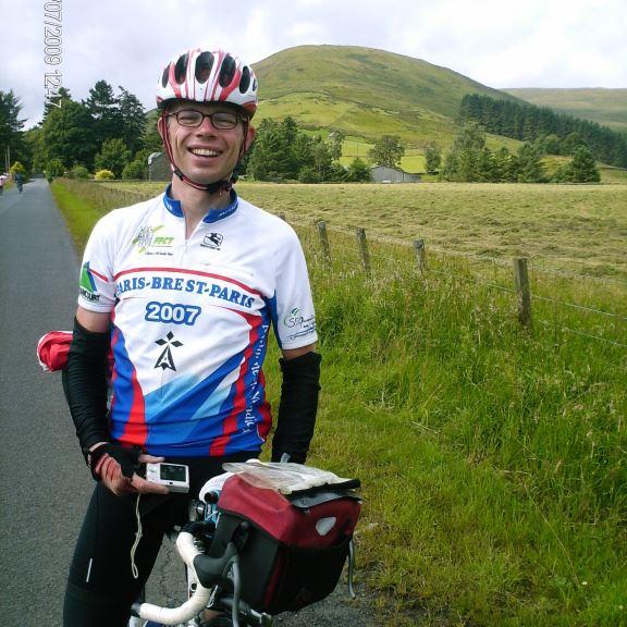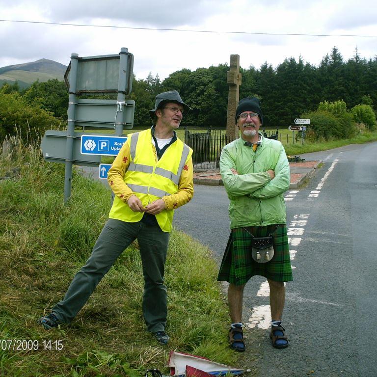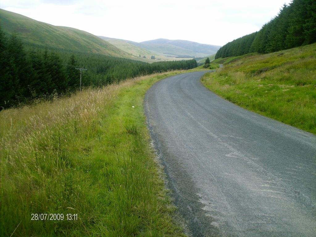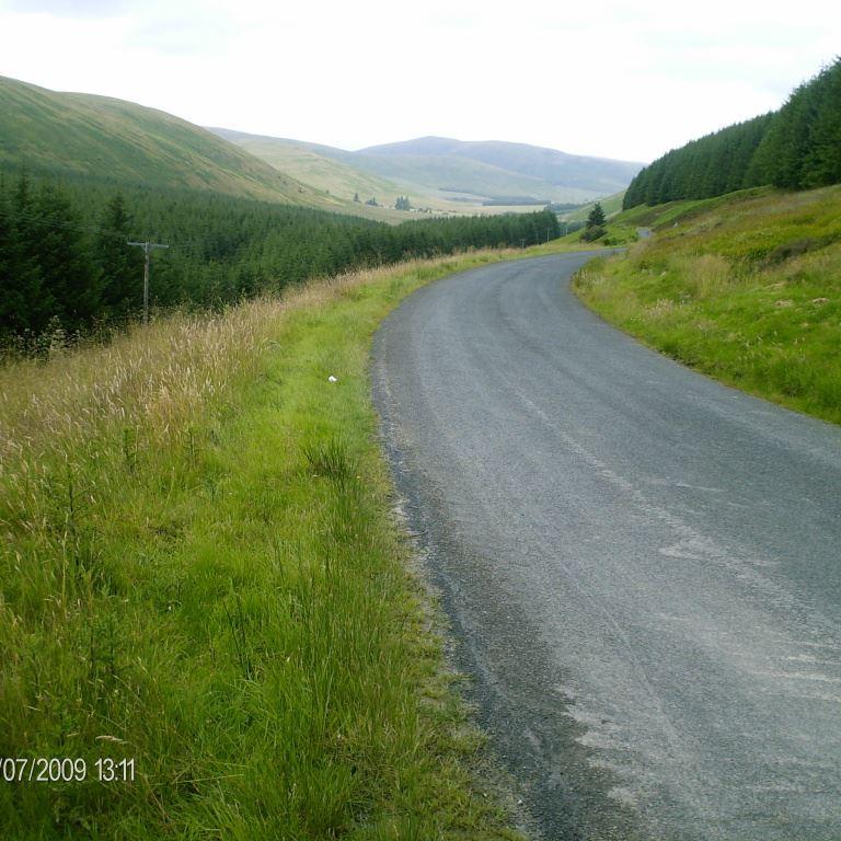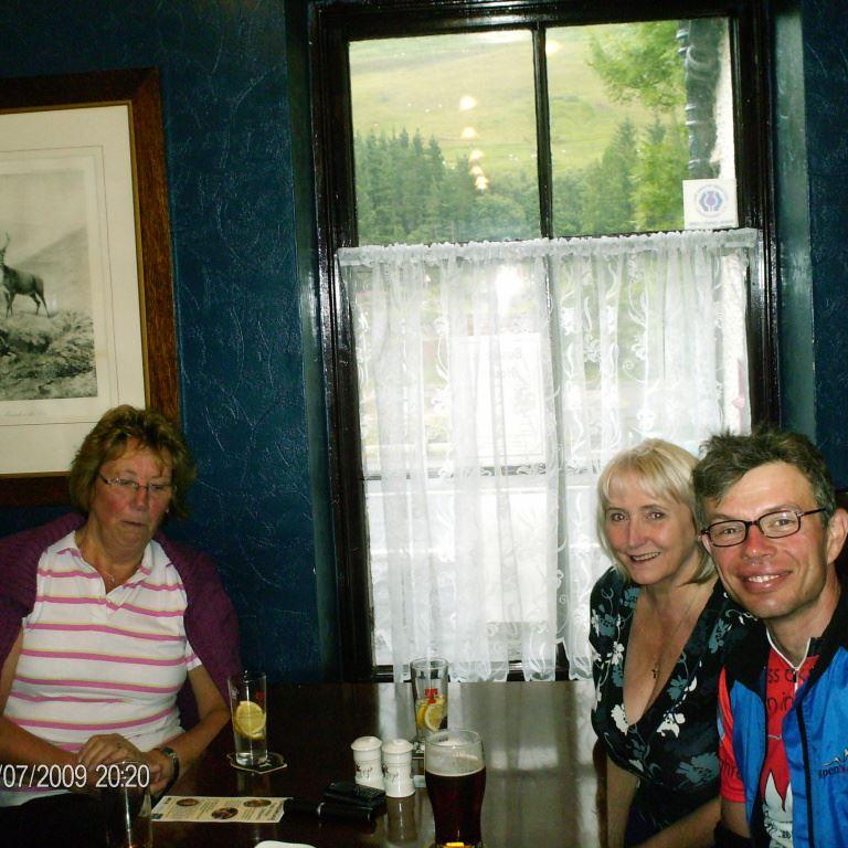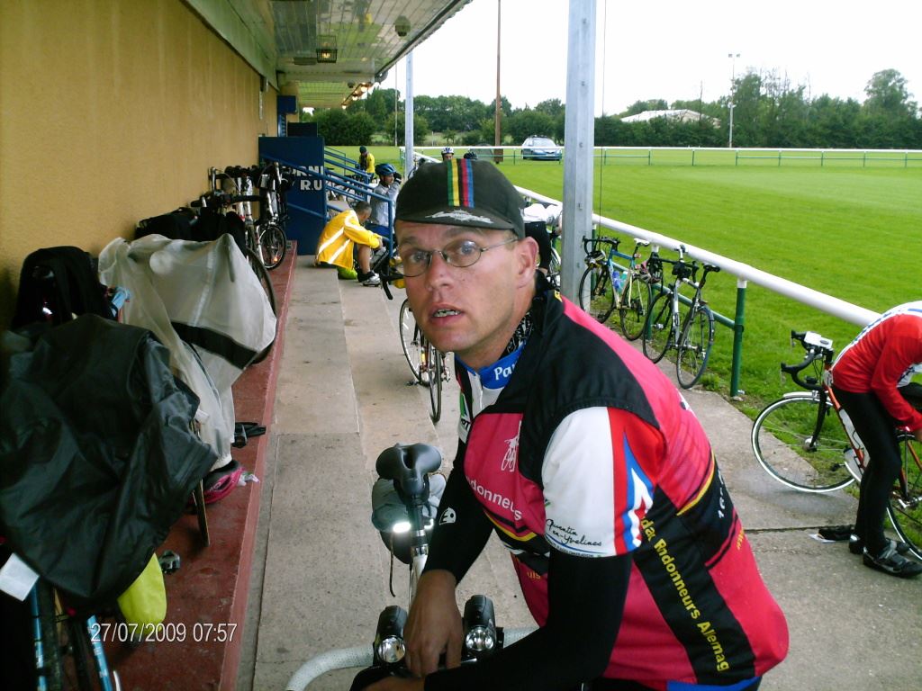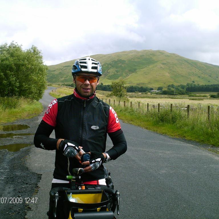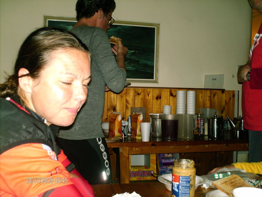 Am Dienstag, den 28.7.2009 standen wir gegen 5 Uhr auf und machten uns gut ausgeschlafen (6 Stunden Schlaf) auf die nächste Etappe. Nicole und KLaus fuhren ohne mich weiter, als ich meine eine Schuhplatte richten mußte, da sie sich verschoben hatte und ich Knöchelschmerzen bekam. Da Nicole und KLaus in der Ebene stärker sind als ich, ich dafür besser die Berge hochkomme, war das in Ordnung so, wir hätten uns sonst gegenseitig gebremst. Wir trafen uns in der nächsten Kontrolle in Eskdalemuir wieder, ich hatte die beiden fast eingeholt. Auf dem Weg nach Eskdalemuir hatte der Wind merklich aufgefrischt, ab Eskdalemuir schob er uns mit Nachdruck die Berge hoch, und ich dachte mit Schaudern an die Rückfahrt, wo wir uns gegen den Wind vorankämpfen mußten. Ich entwickelte mich zum Pannenkönig (insgesamt 6 Platte bei LEL) und Nicole und Klaus zogen an mir vorbei. Kurz vor Edinburgh hatte ich sie aber wieder. Joachim, der Rusty Racer kam mir entgegen, schon auf dem Rückweg von Edinburgh. In Edinburgh war mein Bagdrop, ich duschte und zog frische Radkleidung an. Die alte Kleidung stellte ich in die Ecke und faltete sie mit ein paar Handkantenschlägen zusammen. Nicole hatte mittlerweile ziehmlich starke Knieschmerzen, wollte aber unbedingt weiterfahren so lange es geht. Gegen 16 Uhr ging es aus Edinburgh zurück, und wir kämpften uns die ganzen Berge bei Gegenwind hoch und runter (Maximalgeschwindigkeit bergab 25 km/h!) Am Grdon Arms Hotel, einem Pub an einer Straßenkreuzung, sah ich gerade eine Regenfront über die Bergeauf mich zurollen, da konnte ich nicht wiederstehen (ich war gerade trocken!) und setzte mich in den Pub auf eine Kanne Tee, wo ich gleich mit den Gästen ins Gespräch kam. Nützte aber nichts, es ging raus in den Dauerregen und den Gegenwind (schon fast Sturm) und noch 40 km bis Eskdalemuir. 500 m vor dem Kontrollpunkt hatte ich noch einen Platten! Meine erste Überlegung war, nur kurz in Eskdalemuir zu bleiben, aber der Platte und der Dauerregeln belehrten mich eines besseren, außerdem wäre ich gegen die Strömung nicht die Berge hochgekommen. Die Kontrollstelle war überfüllt, die Feuchtigkeit tropfte von den Wänden (Kondenswasser!) die Betten waren ausgebucht, zum Glück hatte ich meinen Schlafsack dabei, mit dem ich mich in eine Ecke gelegt habe und eine Stunde schlief. Nicole und Klaus waren auch da, hatten aber noch ein Bett abbekommen. Tagesleistung: knapp 265 km, schon etwas besser als gestern!